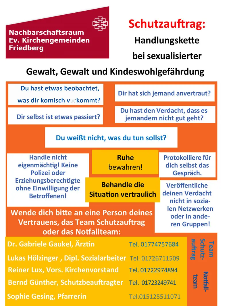 In unserer evangelischen Kirchengemeinde Friedberg erleben Kinder, Jugendliche und schutzbedürftige Erwachsene persönliche Nähe und tiefe Gemeinschaft, die von Vertrauen geprägt ist. Um sicher aufwachsen und sich frei entfalten zu können, benötigen Kinder und Jugendliche Personen, denen sie vertrauen können und bei denen sie Unterstützung, Hilfe, Schutz und Sicherheit finden. Erfahren Kinder und Jugendliche Vernachlässigung oder Gewalt, besonders sexuelle Gewalt, werden ihre Entwicklungsgrundlagen massiv gefährdet und ihre seelische Entwicklung geschädigt. Sexualisierte Gewalt, andere Gewalterfahrungen und Vernachlässigung verletzen die Würde des Menschen.