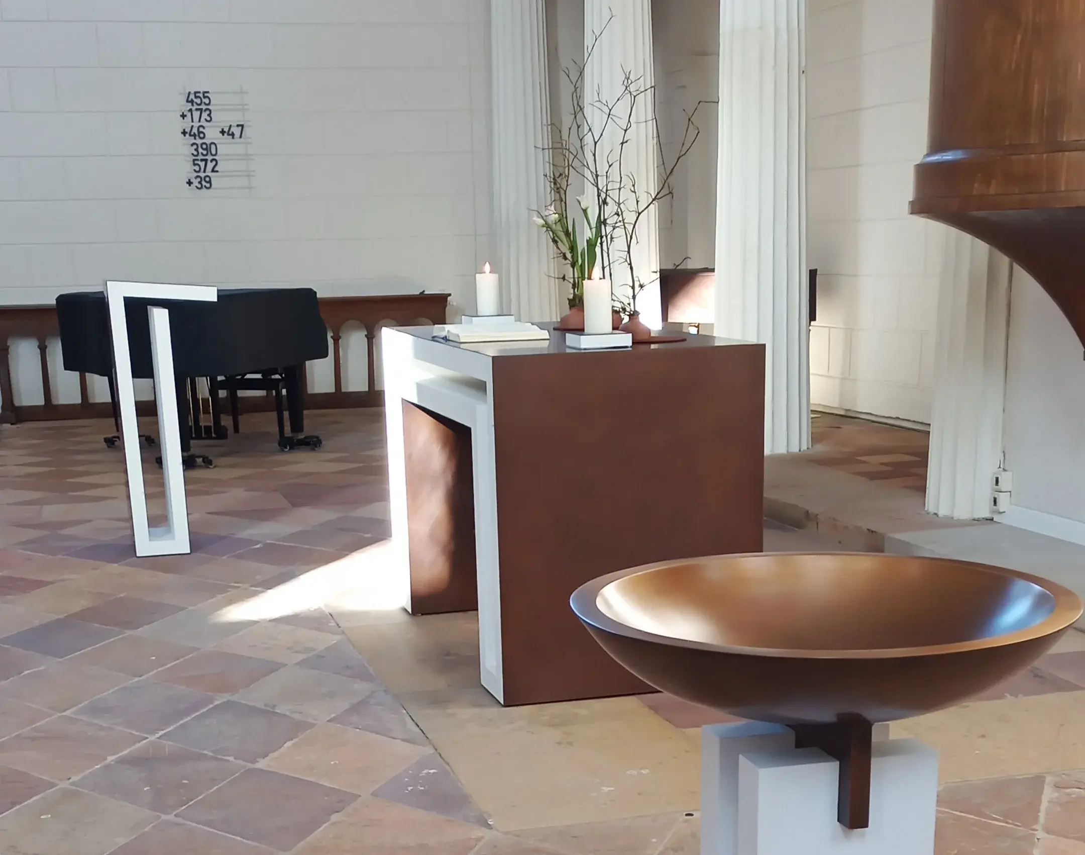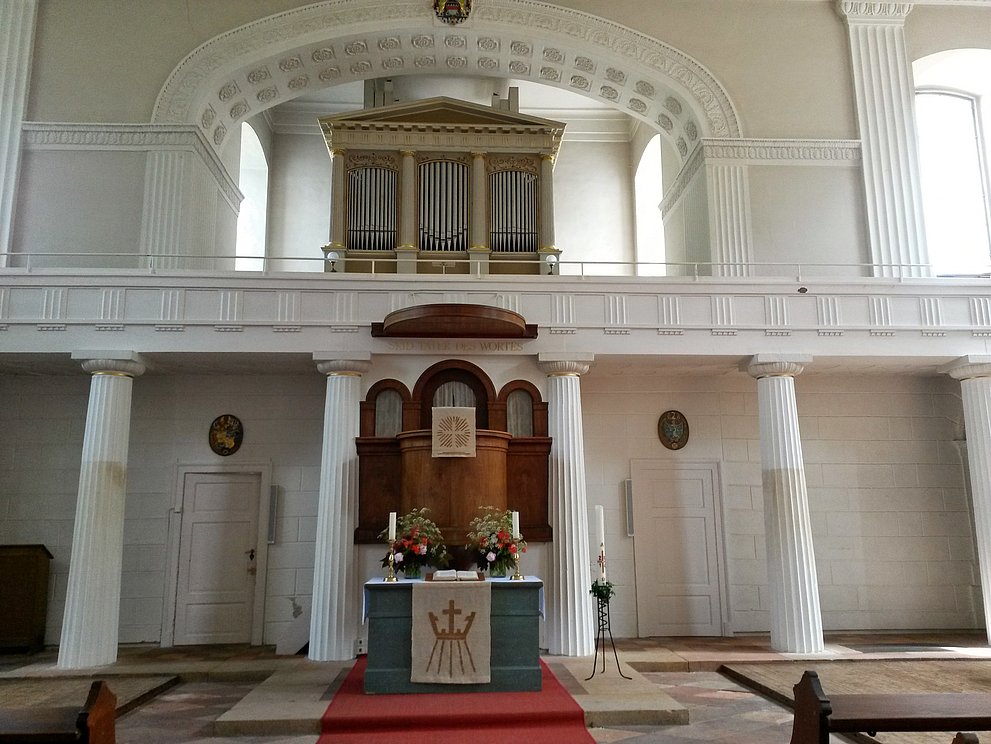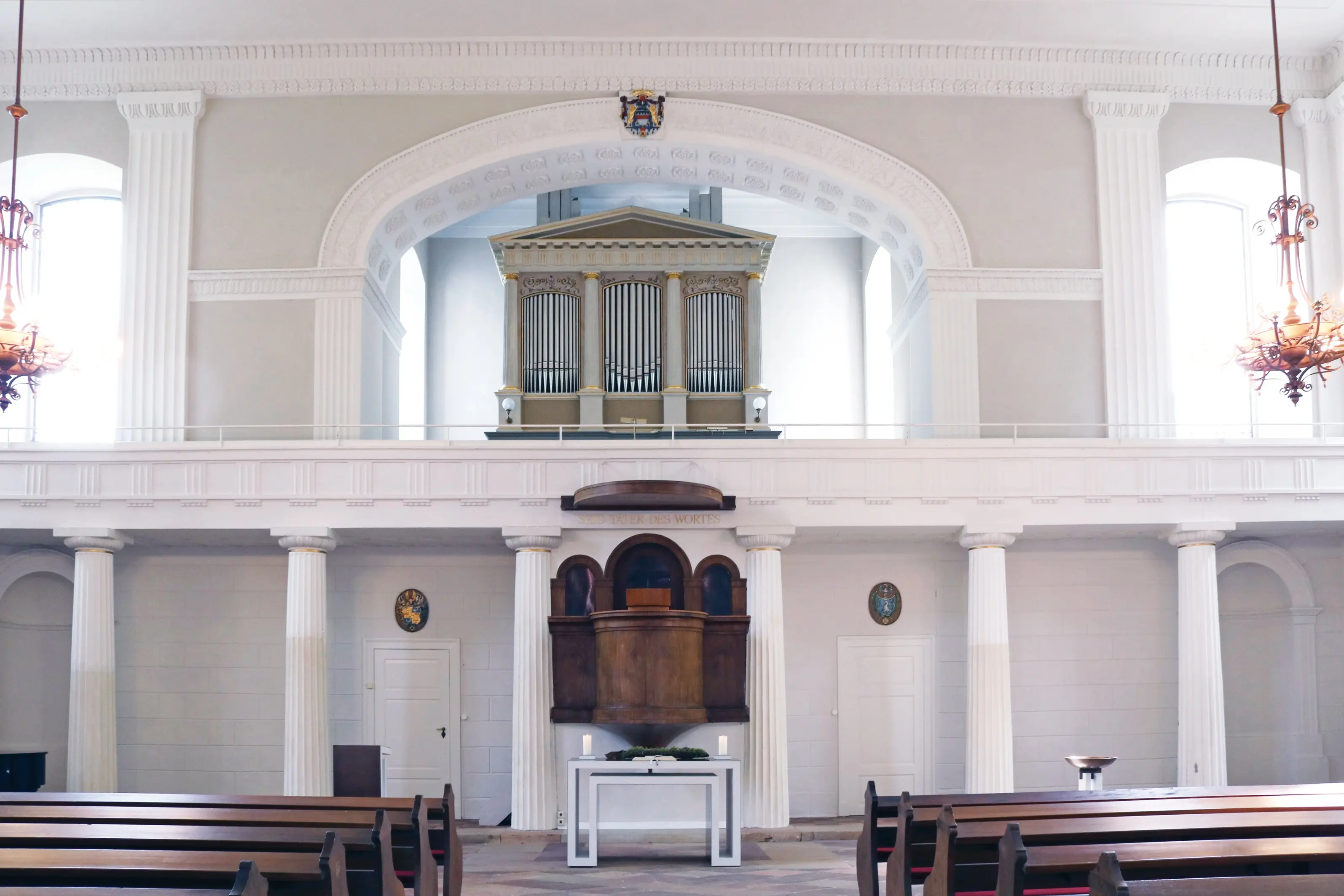 Das Walmdach bedeckt den querrechteckigen protestantischen Predigtsaal mit der klassischen Anordnung von Altar, Kanzel und Orgel in einer Achse.
