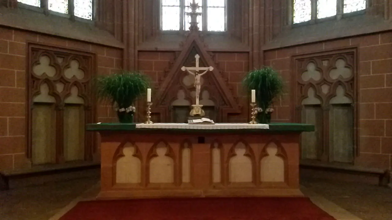 Der rote Sandstein trägt mit zur warmen Ausstrahlung bei, die zurückhaltende Ausstattung (nach einer Innenrenovierung in den 60er Jahren) gibt Menschen und Musik einen weiten Raum, der sich frei gestalten lässt.