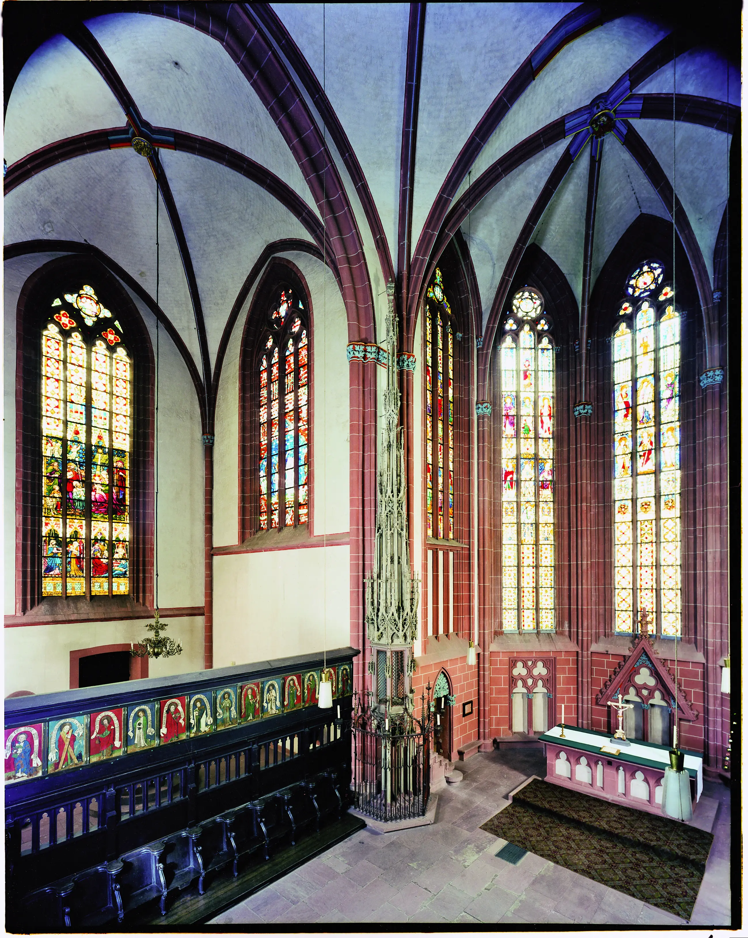 Die 3 zentralen Fenster im Chorraum sind 1472 – 1482 in der Werkstatt des Friedberger Glasermeisters Konrad Rule entstanden. Etwa die Hälfte der Fenster wurden zur Jahrhundertwende von Alexander Linnemann geschaffen, der Rest von verschiedenen namenhaften Künstlern zwischen 1960 und 1994.